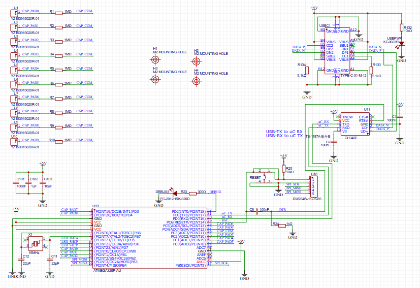 The first is the USB-C connector, which delivers power and allows communication with the PC for programming. It uses the same CH340E USB-to-UART chip that was used in the minimal demo board project. It connects to the serial pins on the ATmega328P microcontroller. That microcontroller exposes the SPI and Reset pins to a female header to allow flashing the Arduino bootloader onto the board on first use. The ATmega328P has the usual supporting circuitry with decoupling capacitors, oscillator, and reset button.