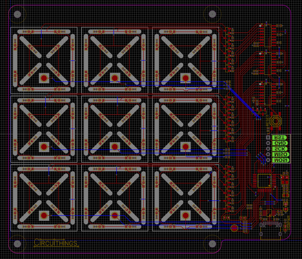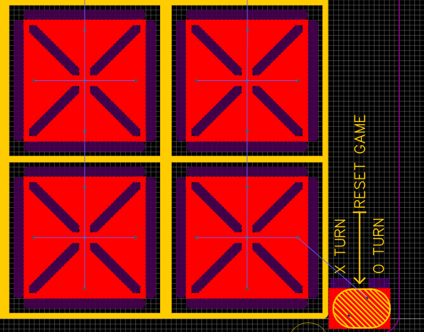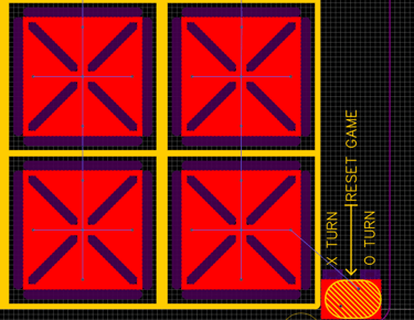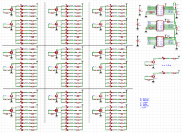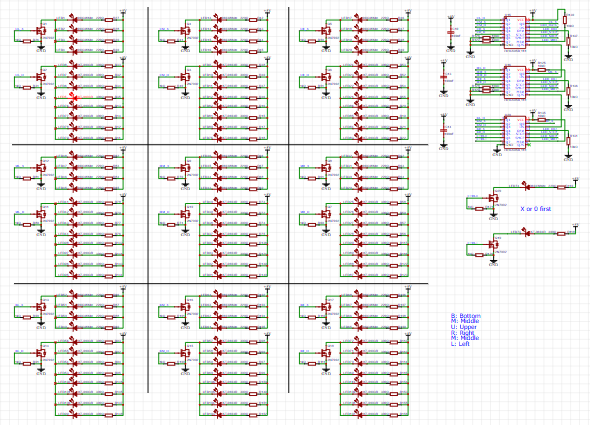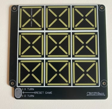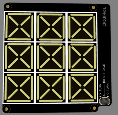 Each tile has LEDs beneath it that either light up a red O or a white X. This is done with regular LEDs, where a group of either 4× white or 8× red LEDs are controlled by a single signal via a transistor, requiring two signals to control one tile. In addition, there are LEDs that control the backlight to indicate whether it's X’s or O’s turn. This requires more signals than there are available pins on the microcontroller, so a couple of 74HC595D shift registers are used, reducing the required pins from 20 to 3.