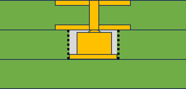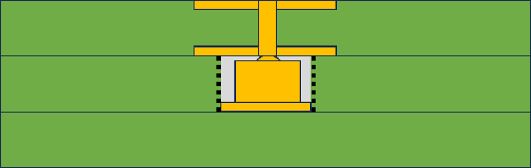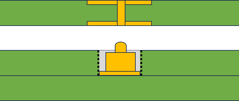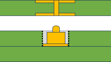 Layout of spacer board. Grey zones are cut-out zones, which are combined with holes to make the final hole shapes. 3D renders shows how it will look when produced