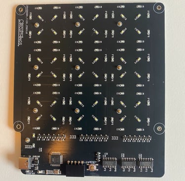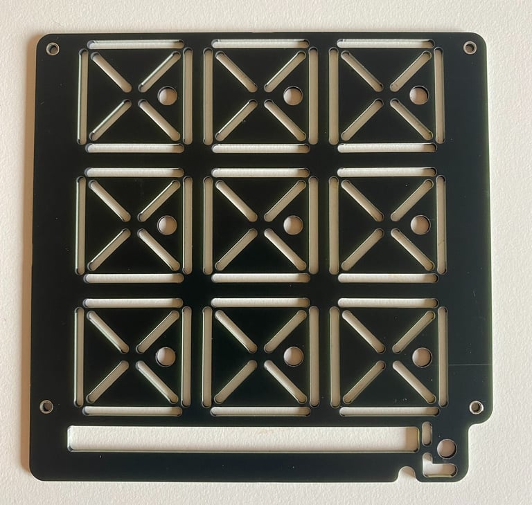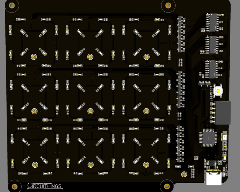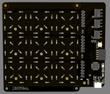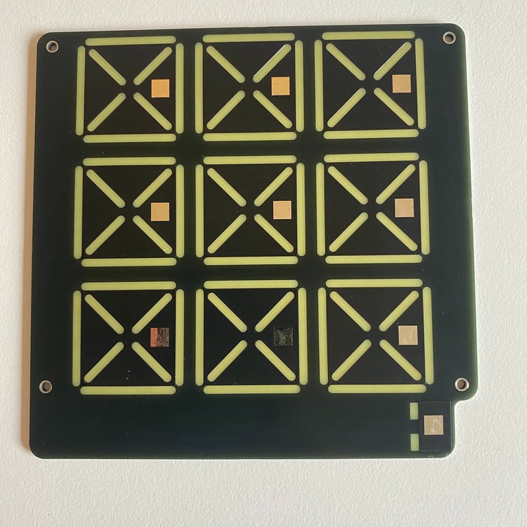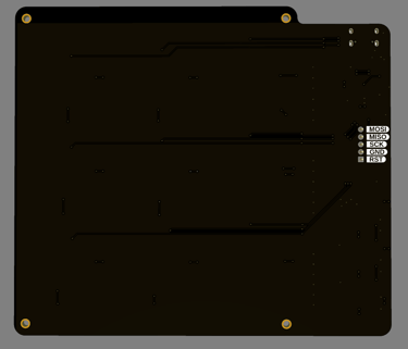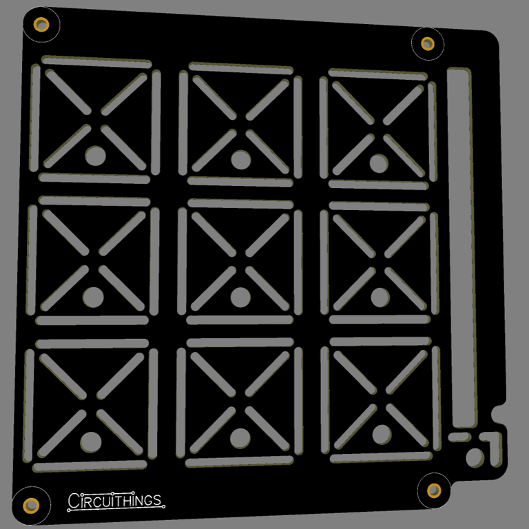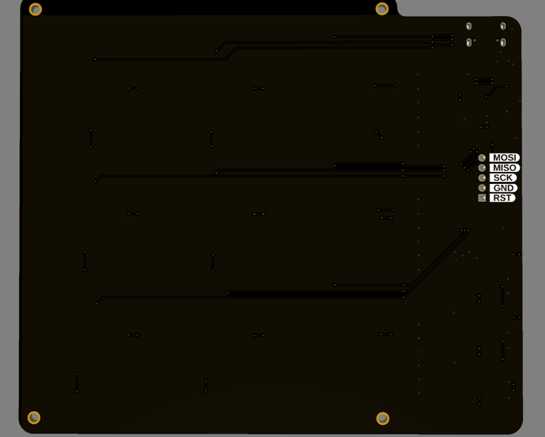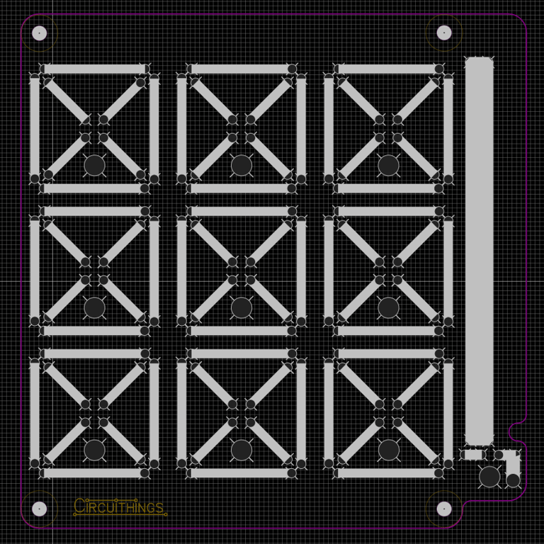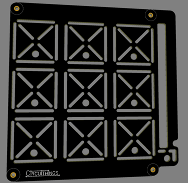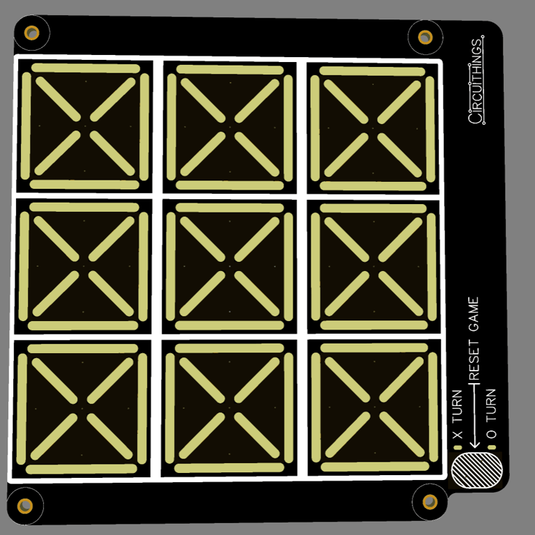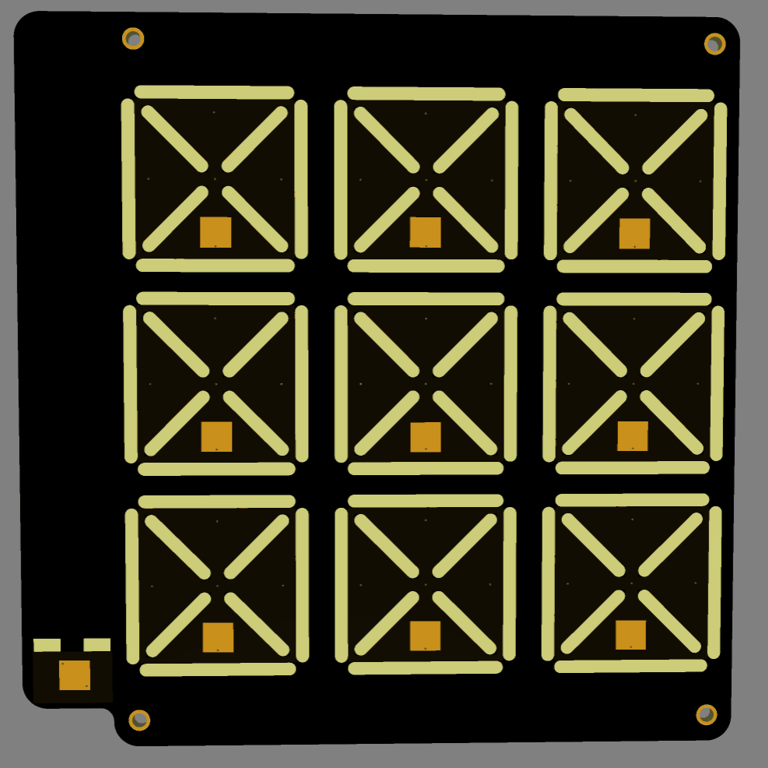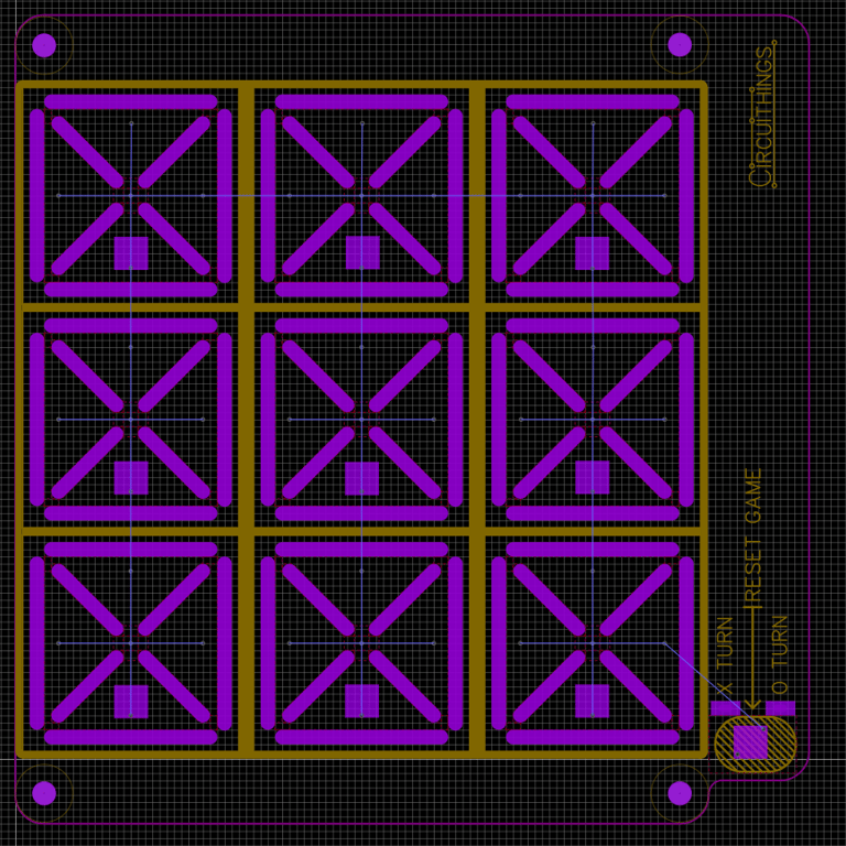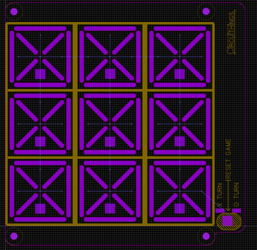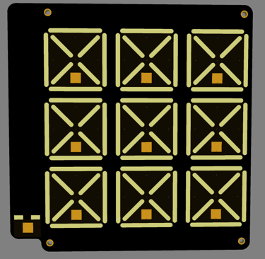 The top PCB, just like the spacer PCB, doesn’t have any electrical components. It only has the solder mask removed where the LEDs shall shine through, mounting holes for screws, and some gameplay elements in silkscreen. The exposed copper pads on the bottom connect via vias to large copper pours that cover the game tiles.