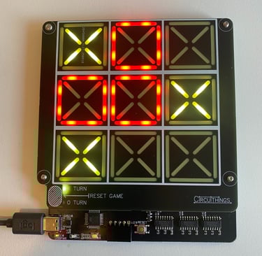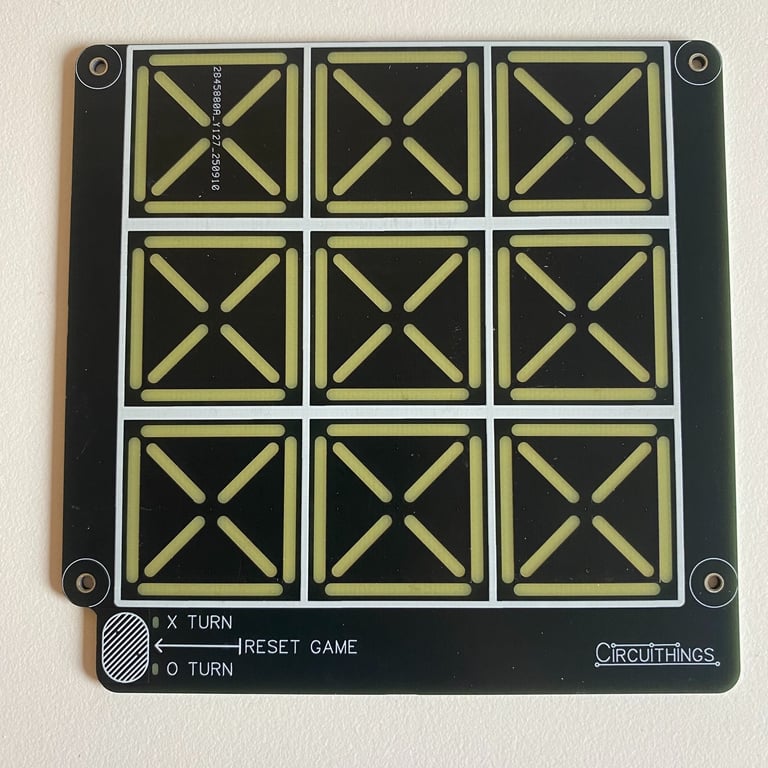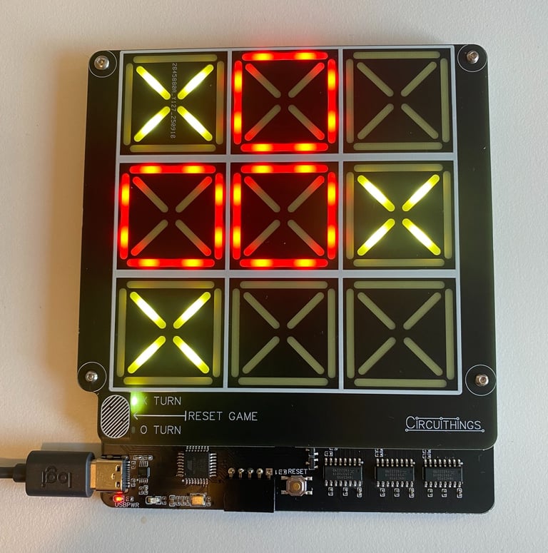 At first power-on (or after pressing reset), the game initializes, sets X as the first player, and clears all tiles. Then it waits for a touch on any of the nine tiles. When detected, it lights up that tile with X, updates the game state array with X at that position, and checks if any of the win conditions are met.
